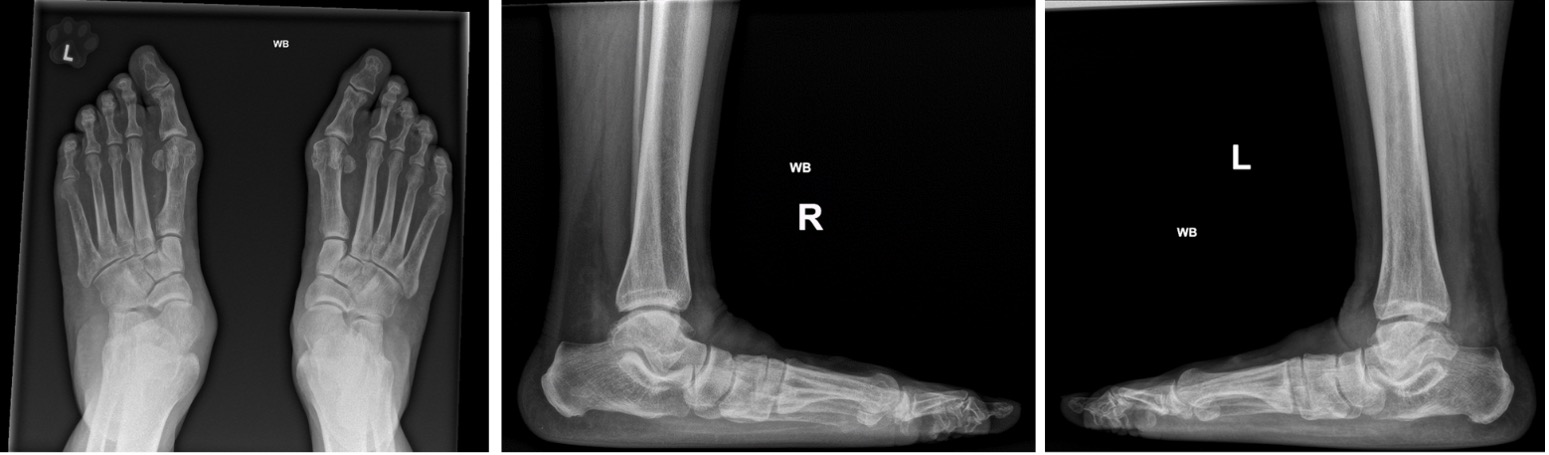 Figure 8: Standing AP and lateral showing bilateral talar head uncovering and loss of Meary’s angle (J&S Stage IIB disease)