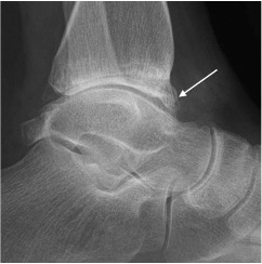 Anterior impingement with anterior distal tibial osseous spur (arrow)