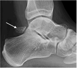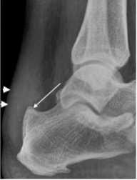 Haglund’s deformity (thin arrow) with soft tissue swelling (bold arrowheads)