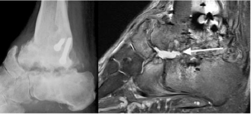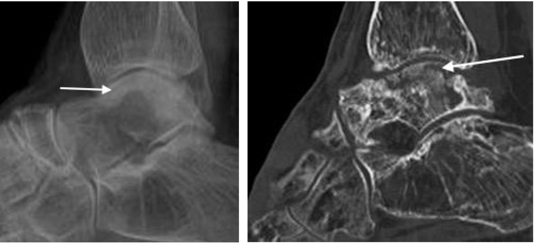 Avascular necrosis of the alar dome following talar neck fracture with subchondral sclerosis and fracture (arrows). Note disuse osteopaenia.