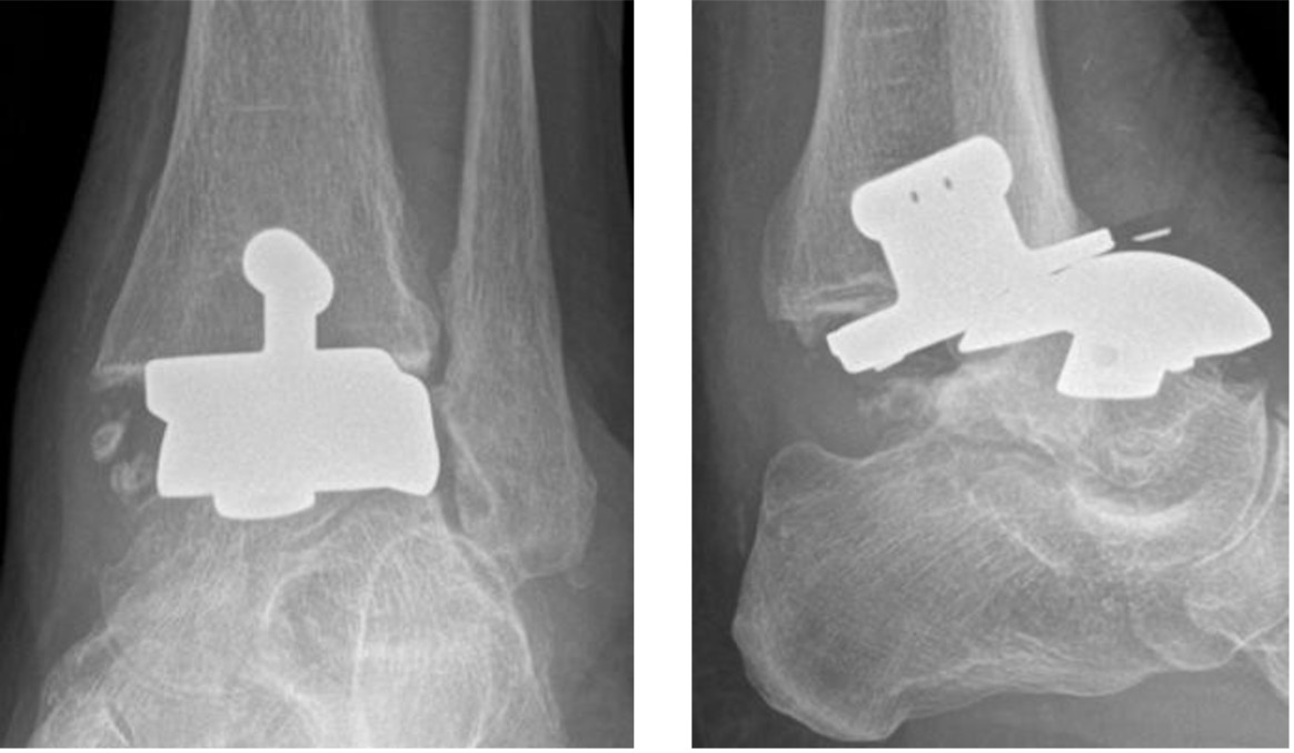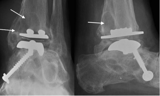 Failing TAR with progressive periprosthetic lucency (arrows)