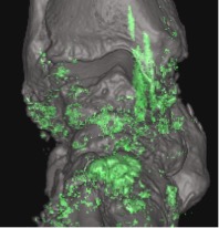 DECT demonstrates diffuse urate deposits in gouty arthritis (green areas)