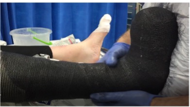 5. First layer of semi-conformable cast tape is applied to the leg and foot, not including the toes. The cast is well moulded throughout. Care is taken to ensure the ankle is in a neutral position.