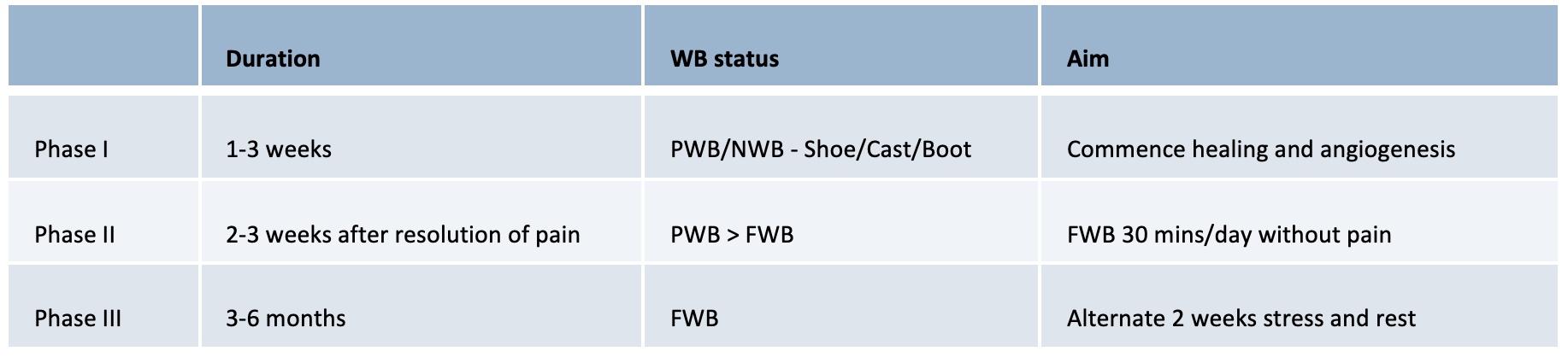- 96% healing at 5 weeks with strict non-weight-bearing cast immobilisation (Torg)