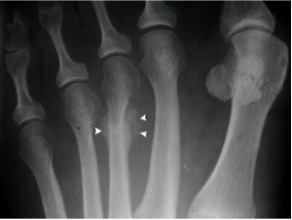 Stress fractures are the result of microscopic injuries following repeated submaximal trauma. They account for about 10-30 % of all sports injuries and, of these, about 32 % are in the foot with 80-90 % in the second and third metatarsals. The fifth metatarsal, followed by the navicular, calcaneum, sesamoids and talus are the other common stress fracture sites in athletes.