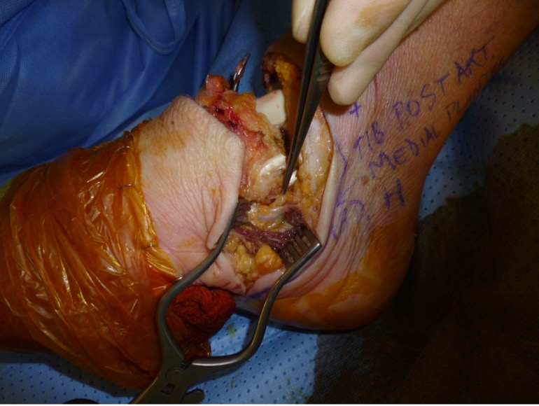 - Identify tibialis anterior and peroneus brevis, divide and prepare for tendon transfer