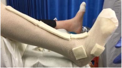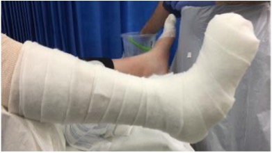 5. First layer of semi-conformable cast tape is applied to the leg and foot, not including the toes. The cast is well moulded throughout. Care is taken to ensure the ankle is in a neutral position.