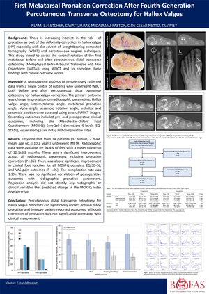 Results: 51 feet from 34 patients (32 Female, 2 Male, mean age 60.3±10.2 years) underwent META. Radiographic data was available for 94.4% of feet with mean follow up of 12.1±3.2 months. There was a significant improvement across all radiographic parameters including pronation correction (p<0.05). There was also a significant improvement in clinical foot function for all MOXFQ domains, EQ-5D-5L and VAS Pain outcomes (p<0.05). The complication rate was 1.9%. There was no significant correlation of post-operative outcomes with radiographic pronation parameters. Regression analysis did not identify any radiographic or clinical variables that predicted change in MOXFQ Index domain score.