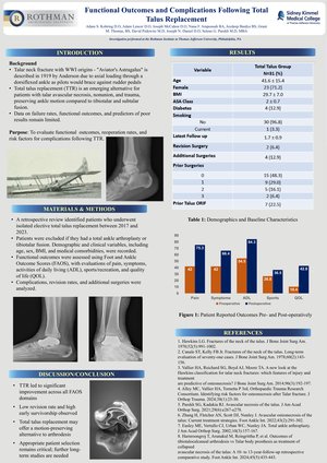 Conclusion: Patients undergoing TTR demonstrated significant improvements in pain, symptoms, and functional outcomes, with high early implant survivorship. Total talar replacement can restore function and mobility in appropriately selected patients, offering a promising solution for those seeking to avoid fusion procedures.