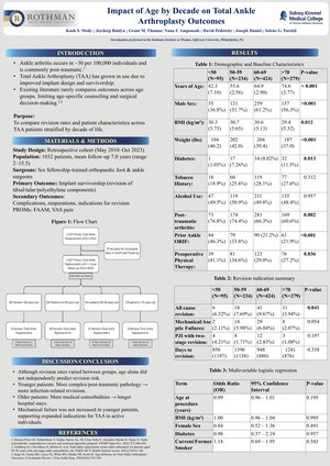 Introduction: Degenerative joint disease or post-traumatic arthritis of the ankle is often addressed using total ankle arthroplasty (TAA). Previous literature has examined outcomes at the extremes of the age continuum, but there are no studies tracking outcomes over time based on age. Thus, the purpose of this study was to compare surgical and patient-reported outcomes (PROM) between patients in different decades of life undergoing TAA.