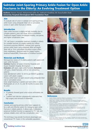 Method: This retrospective study included 14 patients aged ≥60 years with open ankle fractures treated at two UK centres. Patients underwent primary ankle fusion using either an anterograde tibial nail or cannulated screws, preserving the subtalar joint. All surgeries were performed within 12–24 hours of injury, adhering to BOAST with plastic surgery input for soft tissue management. Patients followed a standardized rehabilitation protocol allowing early full weight-bearing. Radiological union was assessed at a minimum follow-up of 1 year and at 18 months.