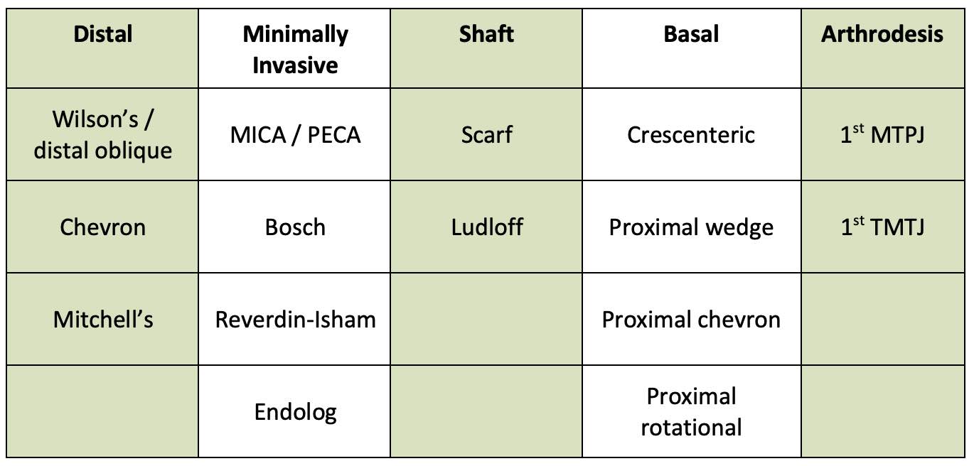 More than 100 different operative procedures have been described to treat hallux valgus. Of these, the scarf or chevron osteotomy can be successfully used to treat the majority of deformities. The chevron is less technically demanding when compared to the scarf. MIS techniques may lead to better early function but with a higher complication rate. Individualised pre-operative assessment of patient factors, anatomic factors and surgical factors need to be considered during surgical planning.