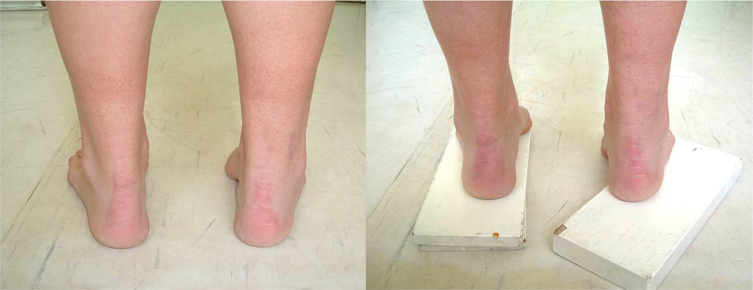 Figure 2b: The outer border of the affected foot is placed on a 2cm board allowing the first ray to drop down; In this case, the heel corrects to neutral / slight valgus with apparent correction of the forefoot adductus.