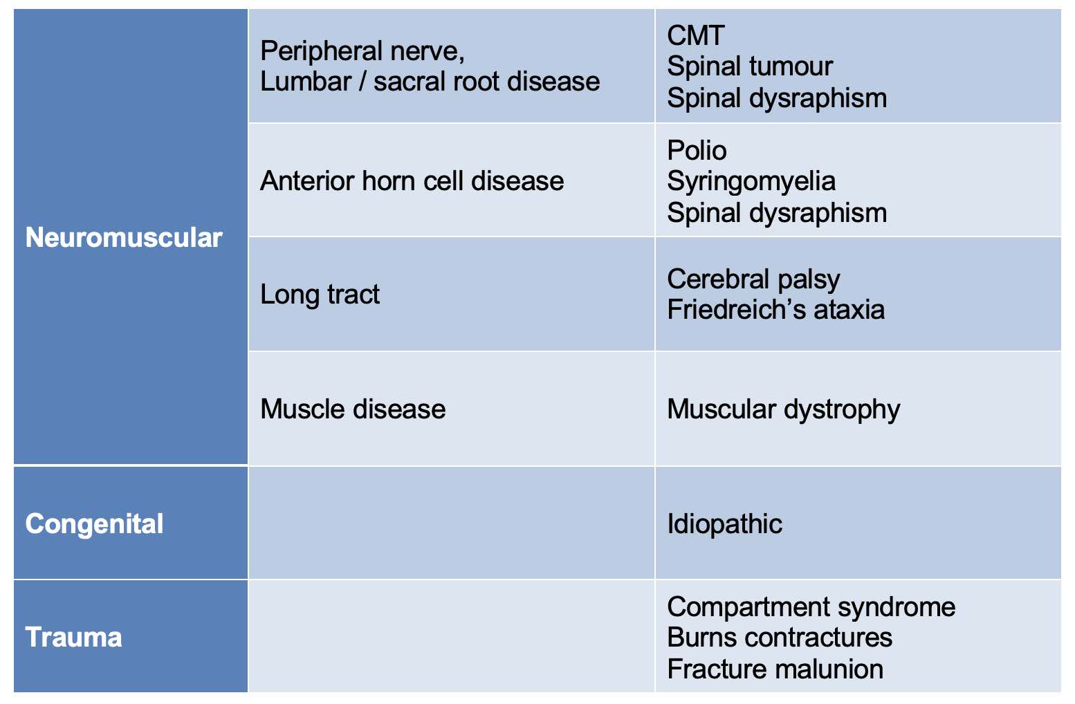 Remember to do a full neurological exam; there is almost always a neurological condition as a cause (50% will be CMT).