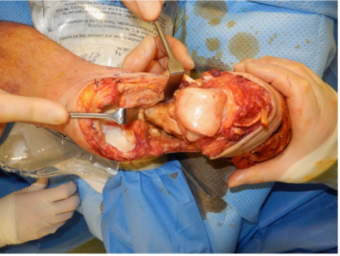 - Enucleation of the talus and calcaneum from the soft tissues (can use an external fixator pin into talus to act as a joy-stick for retraction)