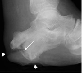 Progressive calcaneal osteomyelitis with ill-defined radiolucency progressing to bone destruction (arrows). Skin ulcers are apparent (arrowheads)