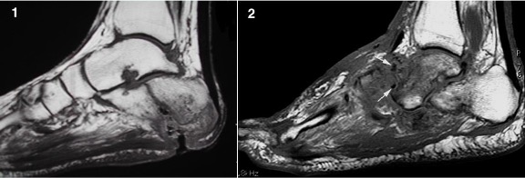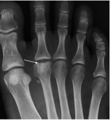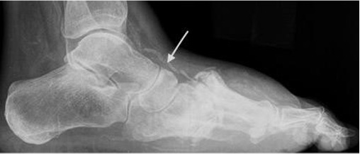 Fig 2: Charcot midfoot with articular (TMTJ) epicentre, sclerotic bone fragments (arrows) and no soft tissue ulcer