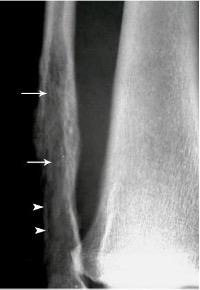 Ewing’s sarcoma with ill-defined, permeative infiltration of fibula (arrows) and cortical destruction (arrowheads)