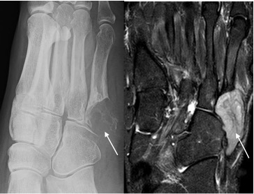 Metastasis base 5th metatarsal seen as lytic destructive lesion (arrow) in patient with known lung carcinoma