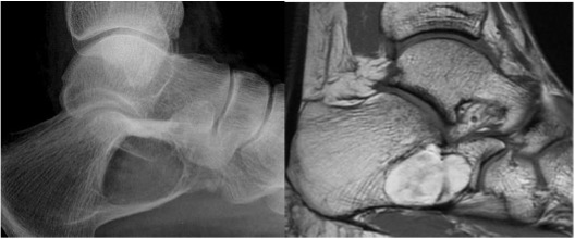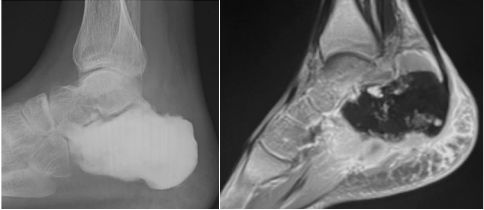 Osteosarcoma calcaneus with sclerosis on xray (left) and low signal on MRI (right) due to osteoid formation