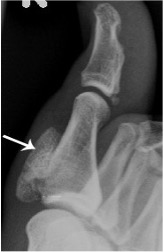 Osteochondroma of first proximal phalanx (arrow)