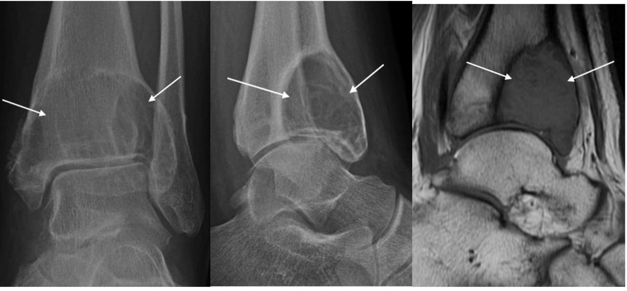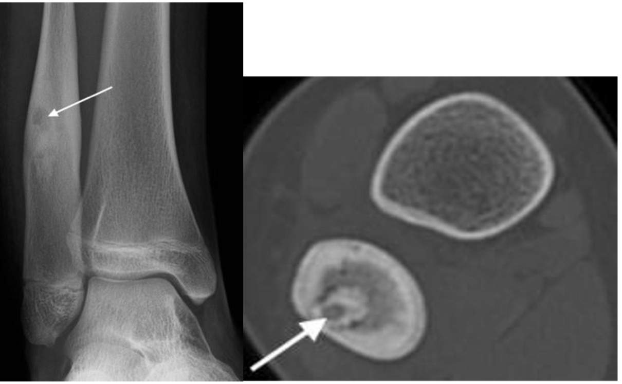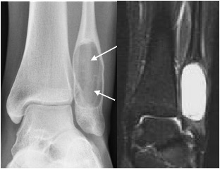 - May occur in distal tibia / fibula, calcaneum and long bones of the foot