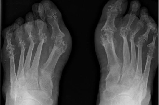 Rheumatoid arthritis with symmetrical MTP joint loss, erosions and subluxation