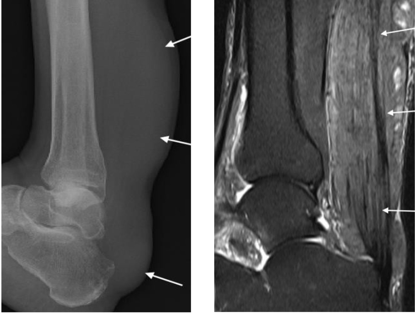 Posterior ankle soft tissue swelling confirmed to be Achilles xanthomatosis on MRI (arrows)