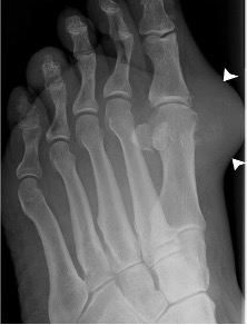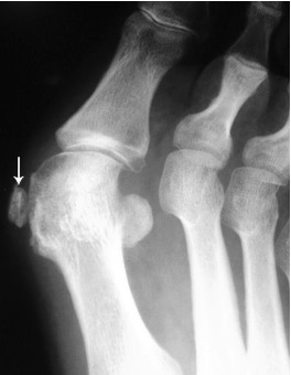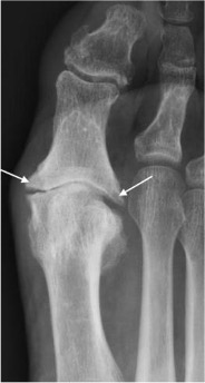 Osteoarthritis of the 1st MTP joint with joint space narrowing, subarticular sclerosis and marginal osteophytes (arrows)