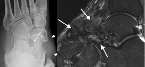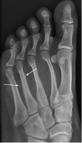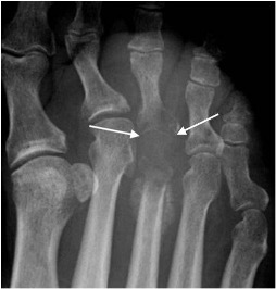Septic arthritis 3rd MTP joint with rapid loss of joint space and periarticular bone destruction (arrows)