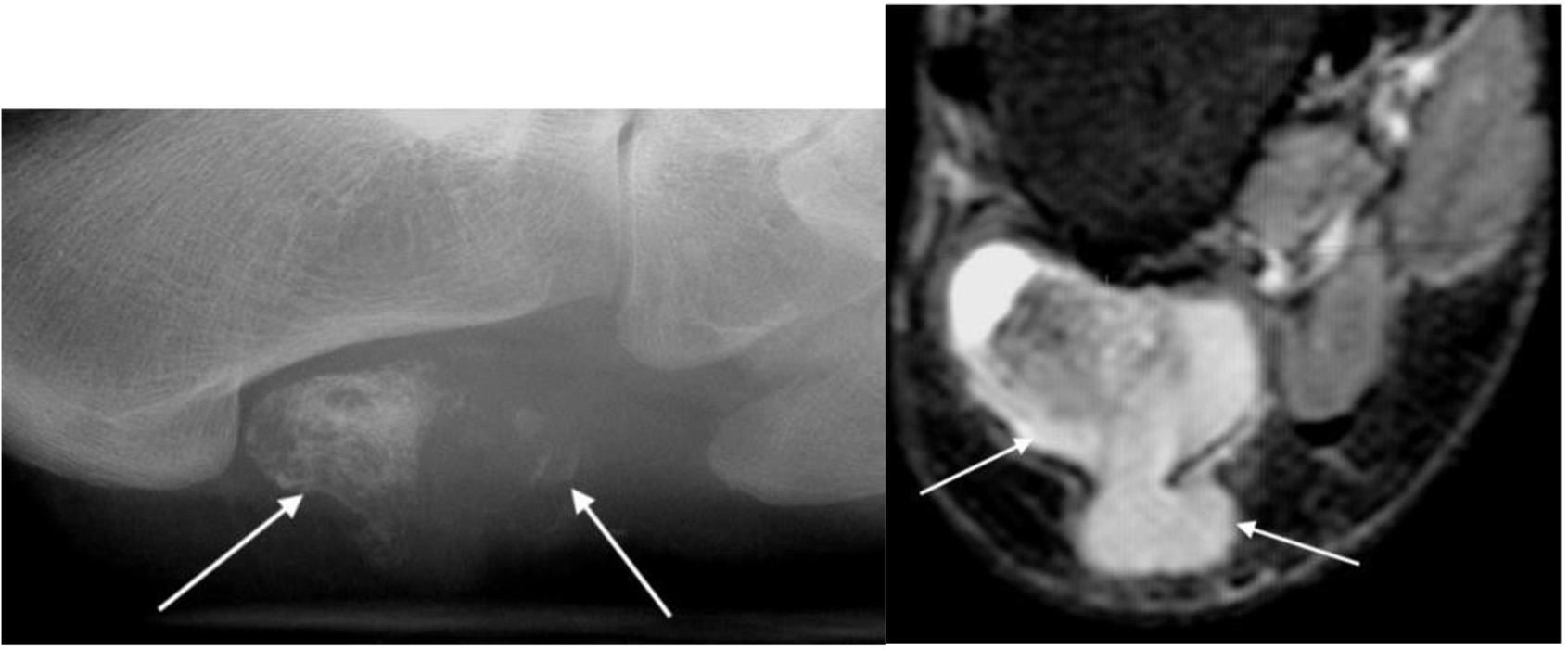 Synovial sarcoma with calcification in soft tissue mass (arrows) on plain radiograph and MRI