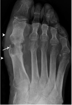 Gout of first MTP joint with well defined ‘punched out’ erosion with overhanging margin (arrow) and soft tissue swelling (arrowheads)