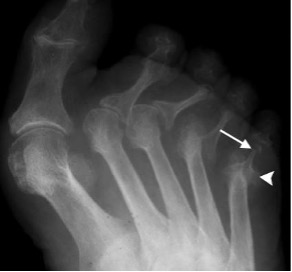 Psoriatic arthropathy with new bone proliferation (arrowhead) and ‘pencil in cup’ appearance (arrow)