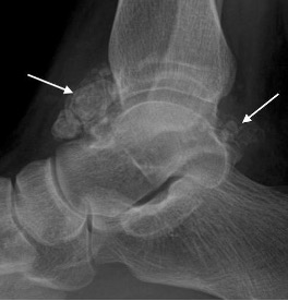Synovial osteochondromatosis of the ankle joint with multiple intra-artcular ossific bodies (arrows)