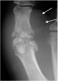 - Well-defined erosions with sclerotic borders which have a ‘punched out’ or ‘rat bite’ appearance and overhanging margin